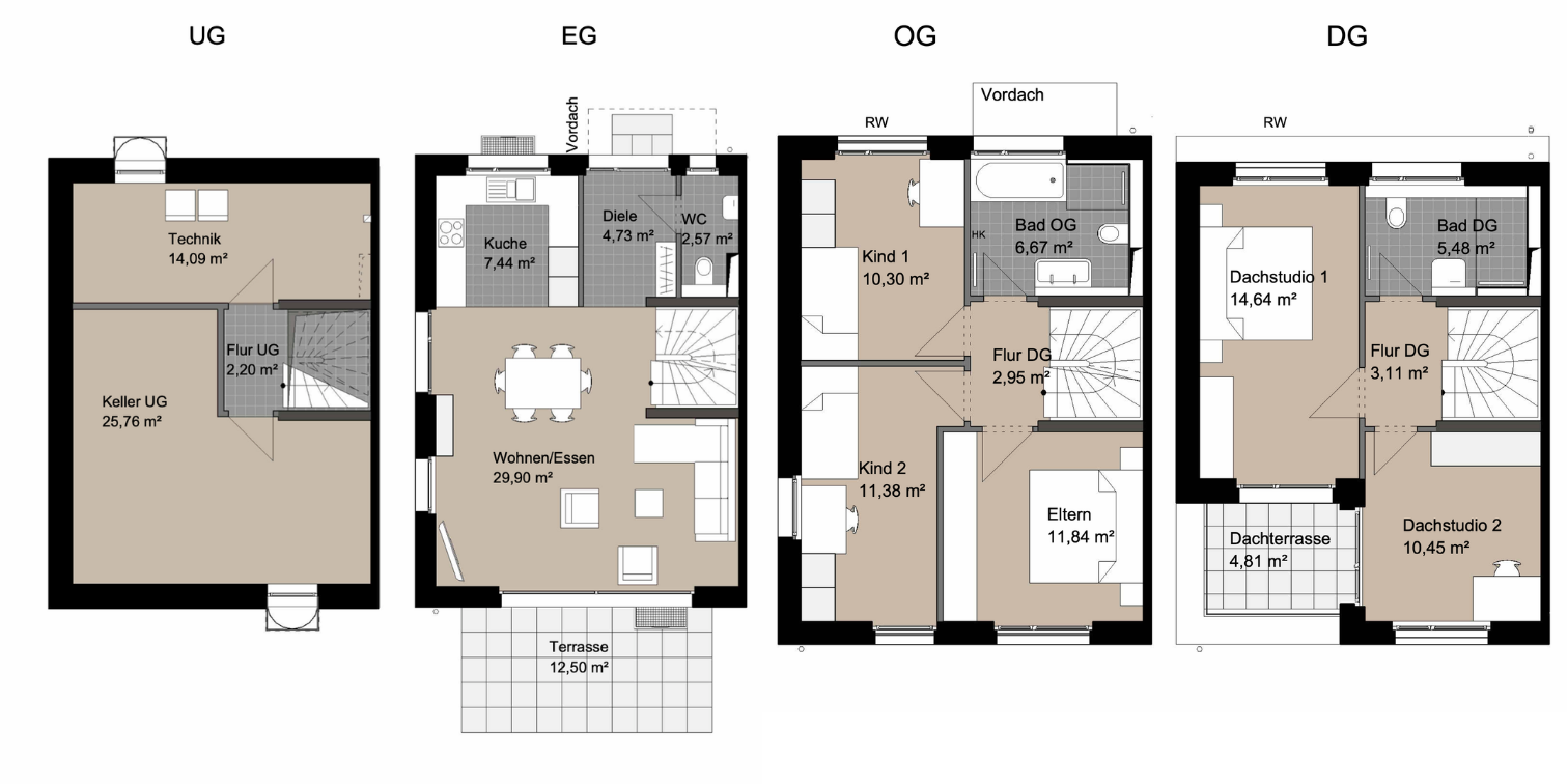 Jedes Reihenhaus erhält einen Garten mit Südwest-Ausrichtung und einer Grundstücksfläche von ca. 125 m² bis 218 m². Der Grundriss ist dabei offen gestaltet und lässt mit vielen Zimmern, verteilt auf einer Wohnfläche von ca. 130 m² keine Wünsche offen. Durch größtenteils nicht tragende Innenwände sind die Grundrisse flexibel veränderbar und lassen sich so perfekt an Ihre Bedürfnisse anpassen.